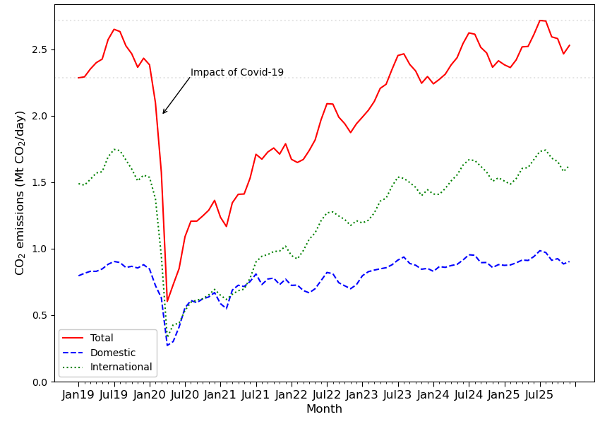 Evolution des émissions de CO2 de l’aviation mondiale (en MtCO2 par jour) pour la période allant de janvier 2019 à aujourd’hui, selon Dannet et al. (2024). Les émissions ont été calculées en reconstruisant le trafic aérien à l’aide de données ADS-B et un modèle de consommation de carburant. La courbe bleue représente les émissions des vols domestiques, la courbe verte les émissions des vols internationaux et la courbe rouge représente le total des deux. Les perturbations des vols liées à la pandémie de Covid-19 ont entraîné une forte diminution des émissions de CO2 en 2020 et 2021, mais les émissions sont revenues à leur niveau de 2019 à la fin de l’année 2024. Le dernier point du graphe correspond au mois de décembre 2025.