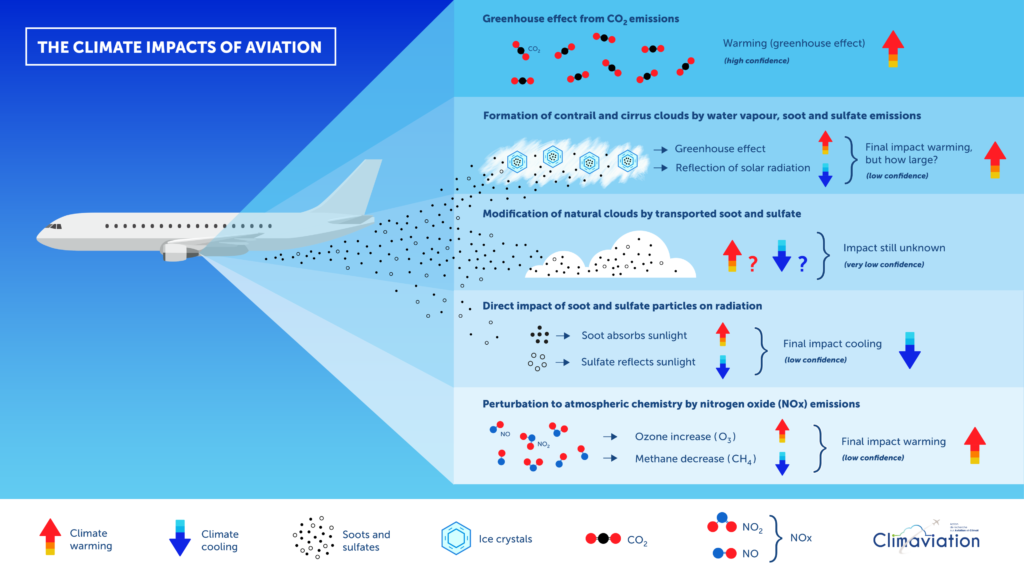 - Water vapour, the main product of hydrocarbon combustion, together with CO2, forms ice crystals as it condenses and then freezes and generates contrails, which depending on atmospheric conditions can persist for up to several hours and eventually evolve into induced cirrus clouds, with a significant local radiative impact. These induced cirrus clouds can have two opposing effects. Depending on the time of day, they can reflect solar radiation (causing cooling), but can also block outgoing infrared radiation (causing warming).