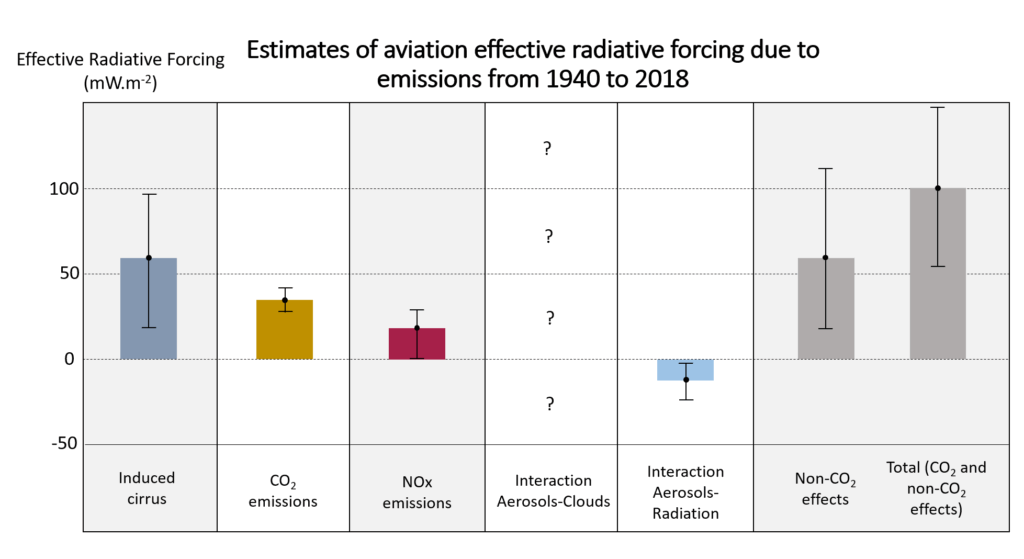 According to the most recent estimates, based on climate modelling, the impact of non-CO2 effects could be greater than that of CO2, at least in the short term, but the level of uncertainty in these estimates remains high due to the complexity of the mechanisms to be modelled and the many scales to represent in the simulations.
